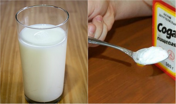 - Налей молоко в подходящий таз и опусти в него ноги. Всыпь 2 ст. л. соды.
